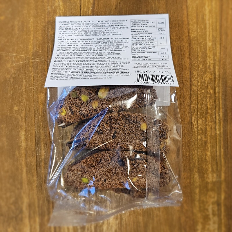 Der große Verwandte der Cantuccini aus Prato eignet sich hervorragend zum Stippen in Kaffee und Tee. Die sechs Cantuccioni sind dunkel vom Kakao und mit grünen Pistazien bestückt.
